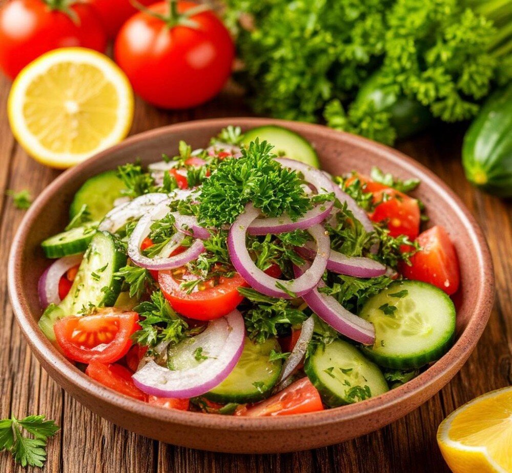 Огурцы, помидоры, красный лук, микс зелени, оливковое масло, лимон