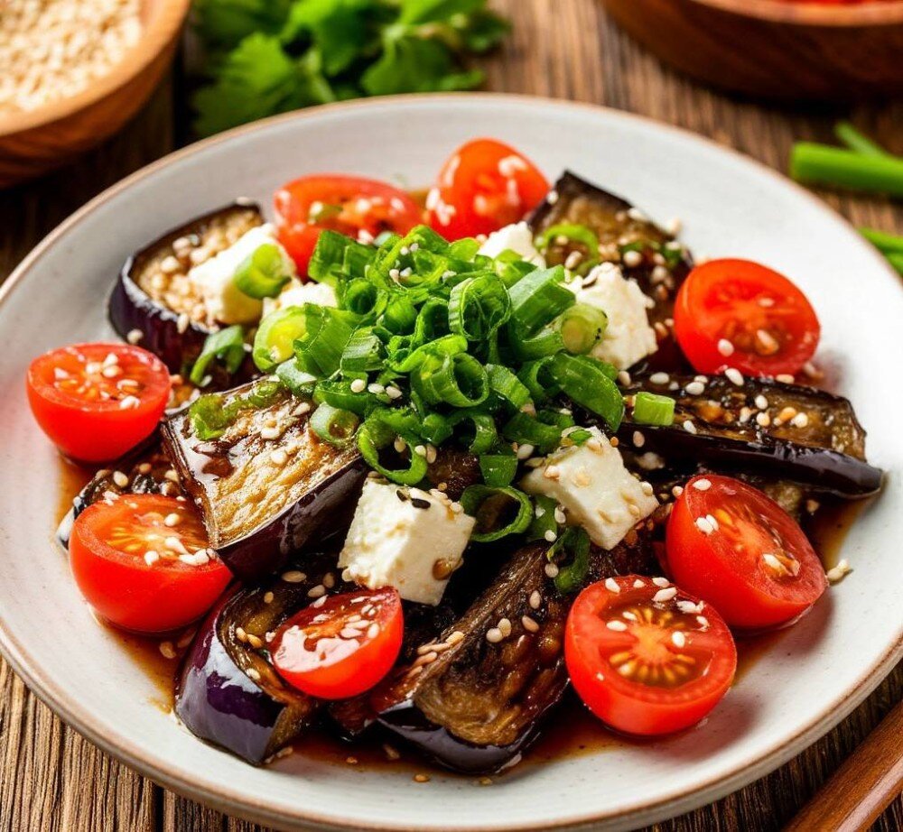 Баклажаны, помидоры черри, сыр творожный, соус устричный, зелёный лук, кунжут