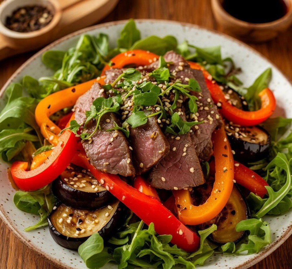 Болгарский перец, язык говяжий, баклажан, помидор, руккола, кунжут, устричный соус