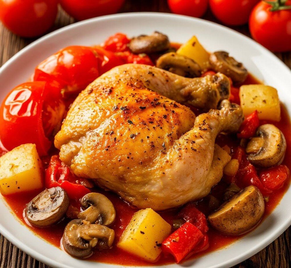 Цыплёнок, болгарский перец, лук репчатый, картофель, грибы, помидоры