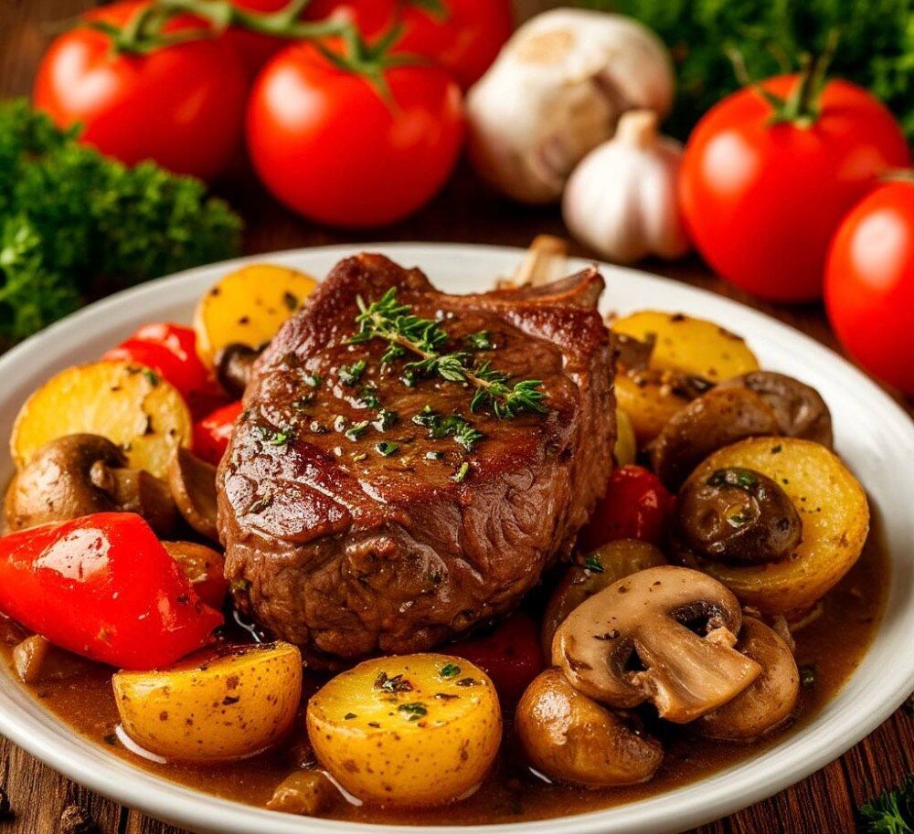 Баранина, лук репчатый, болгарский перец, картофель, грибы, помидоры