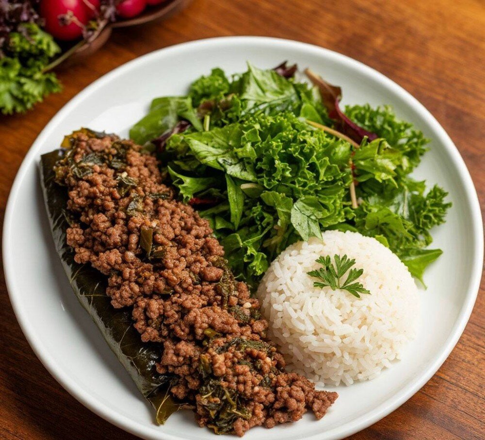 Виноградные листья, рубленое мясо, рис, микс зелени, мацонни