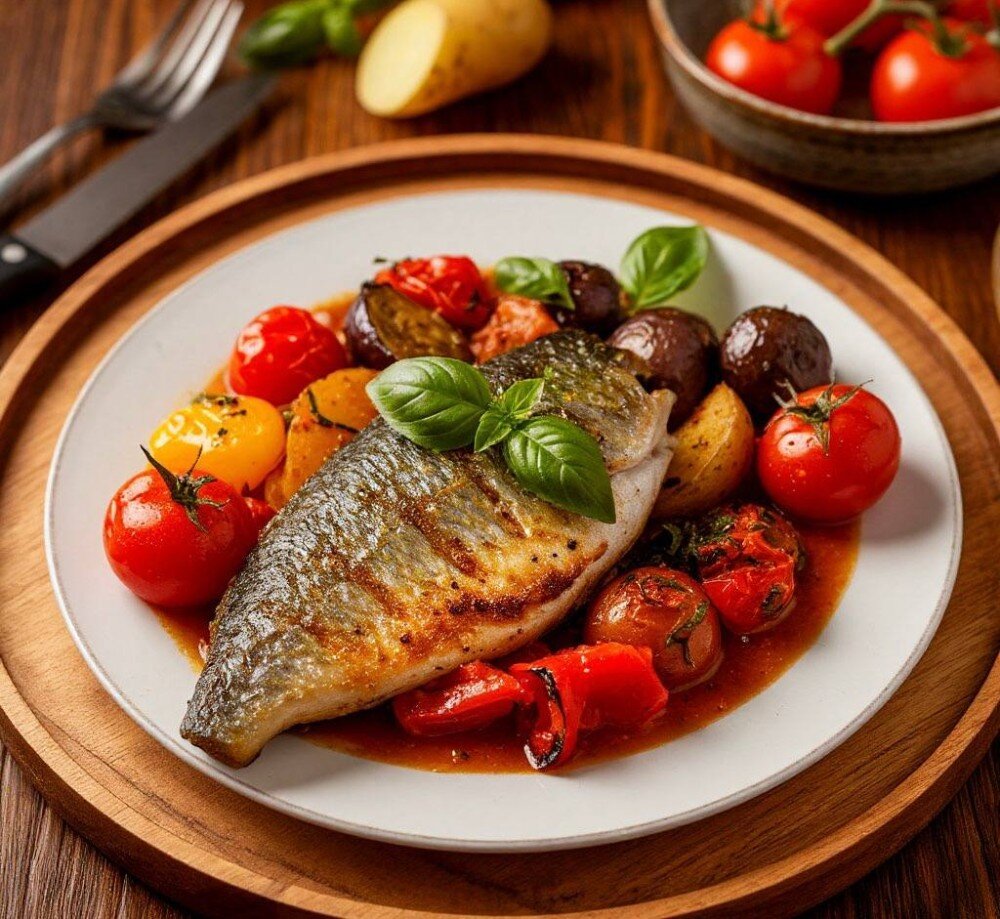 Филе дорадо, баклажан, перец, картофель, помидоры, базиликовый соус